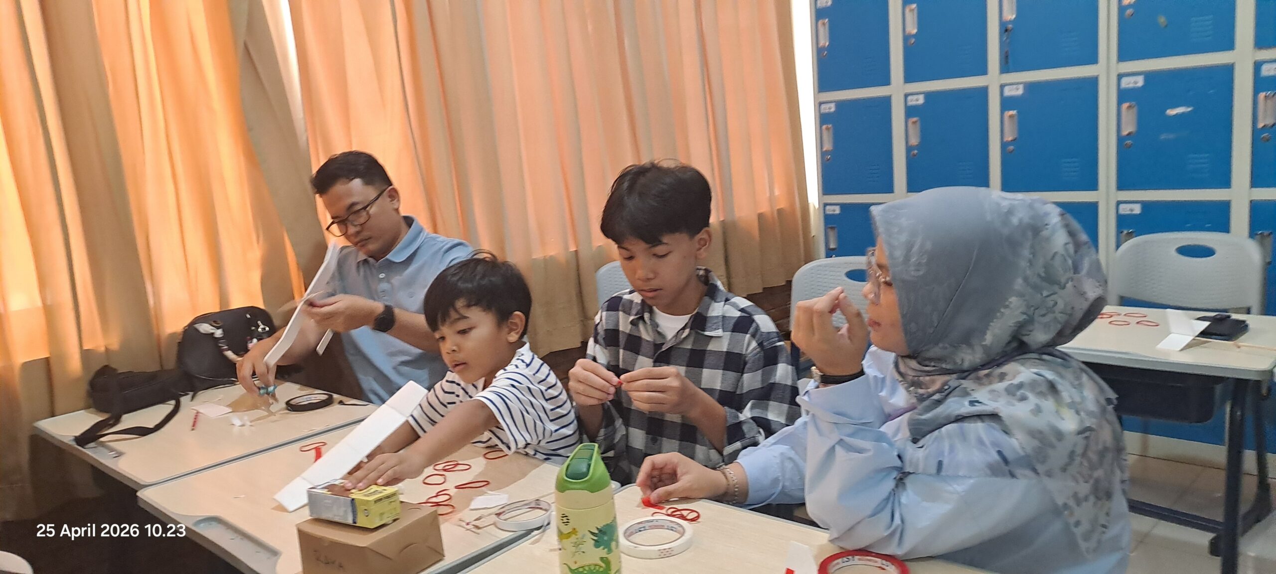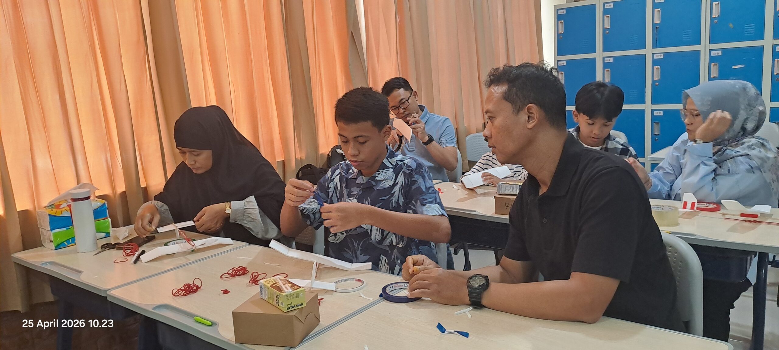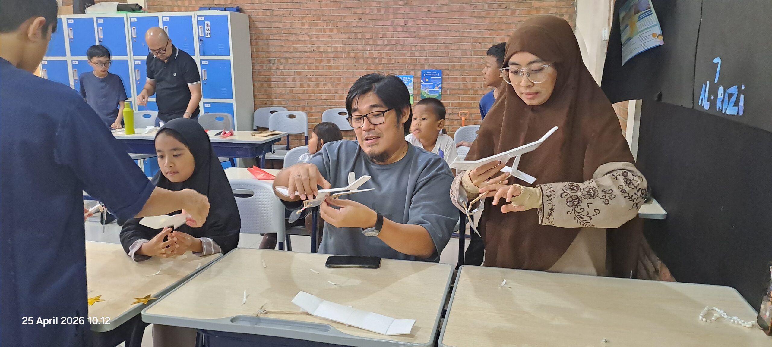 Di dalam kelas, meja-meja dipenuhi potongan kayu balsa, sayap dari lembaran tipis hard styrofoam, baling-baling plastik, dan gulungan karet gelang. Para siswa yang biasanya menjadi peserta kini berganti peran menjadi “mentor kecil” bagi ayah dan bunda mereka sendiri.