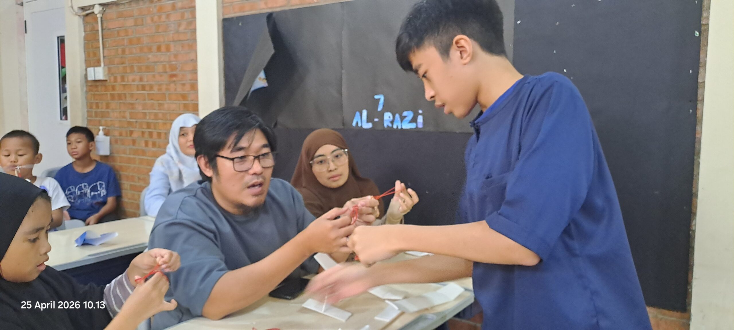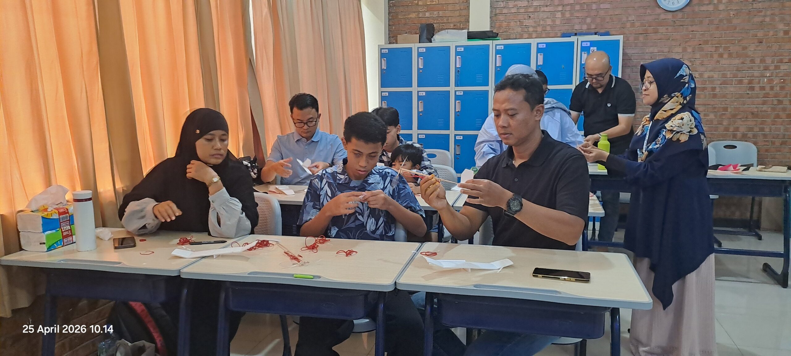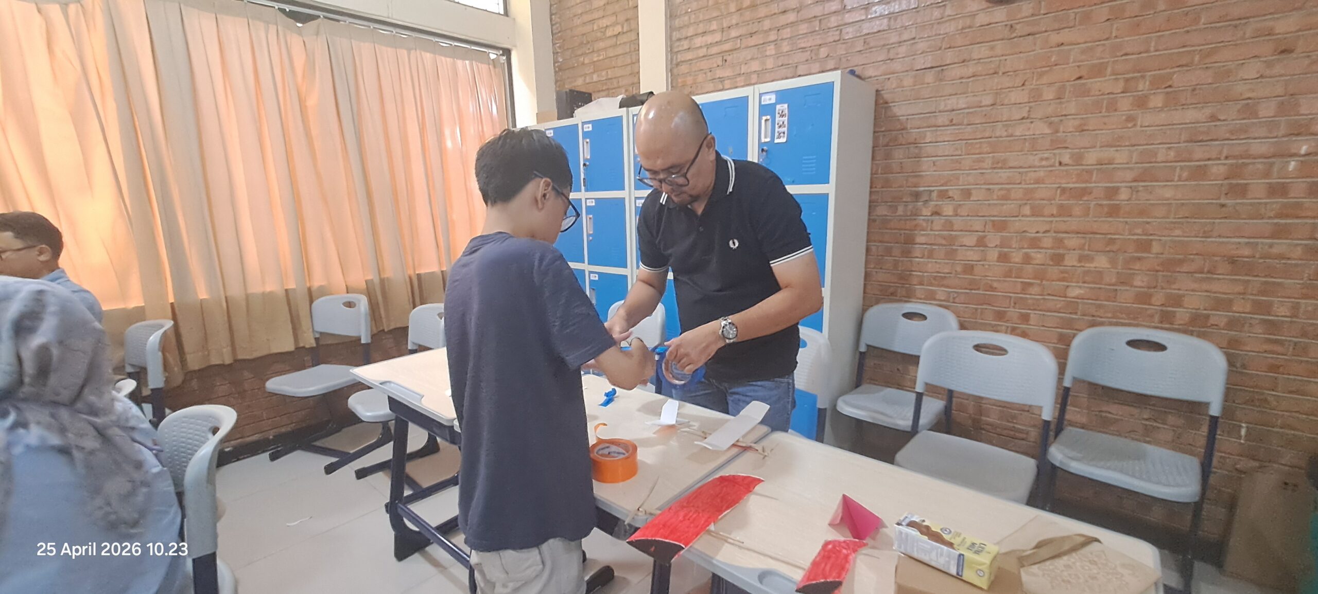 Di dalam kelas, meja-meja dipenuhi potongan kayu balsa, sayap dari lembaran tipis hard styrofoam, baling-baling plastik, dan gulungan karet gelang. Para siswa yang biasanya menjadi peserta kini berganti peran menjadi “mentor kecil” bagi ayah dan bunda mereka sendiri.